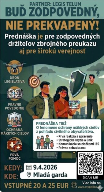 Prednáška o krajnej núdzi, nutnej obrane, oprávnenom použití zbrane, prvej pomoci, údržbe zbraní, problematiky bezpilotných lietadiel „Dronov“ a  fenoméne ochrany mäkkých cieľov z pohľadu civilného obyvateľstva.